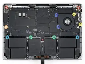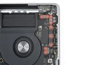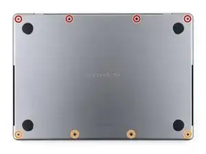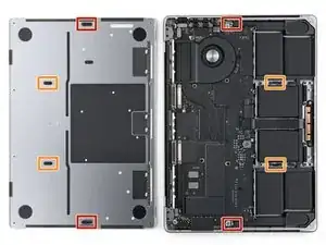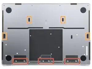 Используйте отвёртку P5 pentalobe, чтобы вынуть восемь винтов, фиксирующих нижнюю крышку: