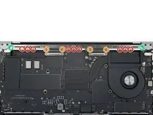 Используйте отвертку 5IP Torx Plus, чтобы снять восемь винтов вдоль правого края, нижнего края и вентилятора: