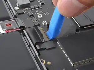 Используйте плоский конец лопатки, чтобы приподнять и отключить два пресс-разъёма портов USB-C.