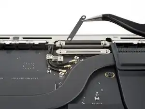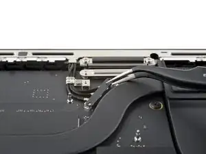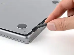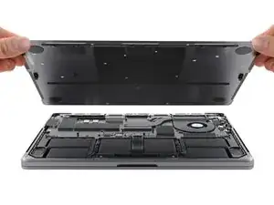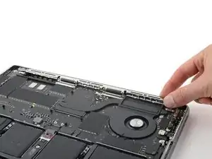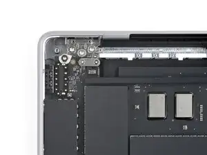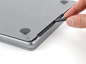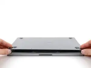 По заднему краю MacBook расположены защёлки, фиксирующие нижнюю крышку. На этом шаге вы сдвинете нижнюю крышку от петель, чтобы освободить её от этих защёлок.