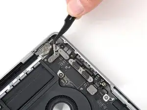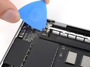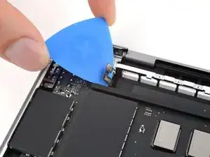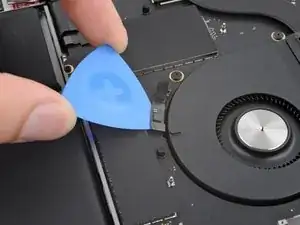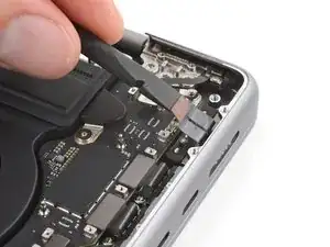 Используйте плоский конец лопатки, чтобы приподнять и отключить пресс-разъём порта MagSafe.