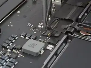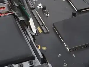 Используйте острый наконечник лопатки, чтобы поднять маленькую фиксирующую защёлку ZIF-разъёма кабеля данных батареи на плате логики.