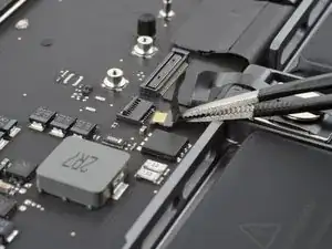 С помощью пинцета отогните ленту, закрывающую ZIF-разъём кабеля данных батареи на плате логики.
