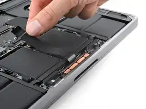 Отклейте кабель трекпада от платы аккумулятора и отведите его через передний край MacBook.
