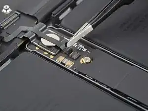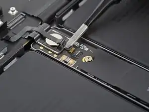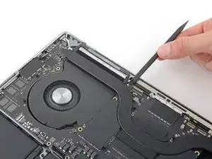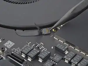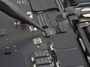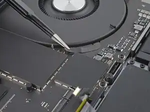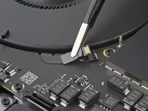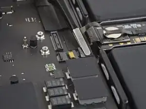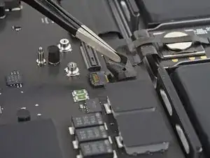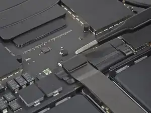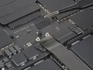 Используйте острие лопатки или чистый ноготь, чтобы приподнять маленькую фиксирующую планку на ZIF‑разъёме кабеля данных аккумулятора.