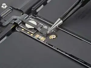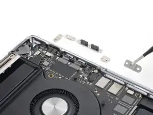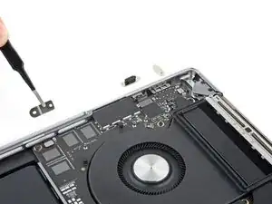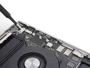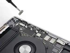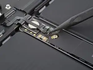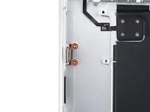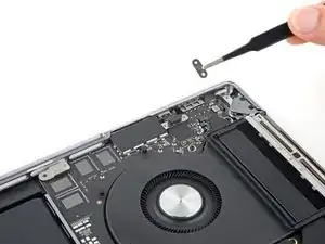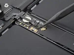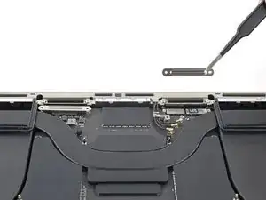 Используйте отвёртку 3IP Torx Plus, чтобы выкрутить два винта длиной 2.1 мм, фиксирующие планку кабеля трекпада.