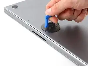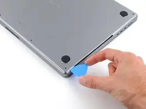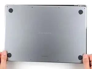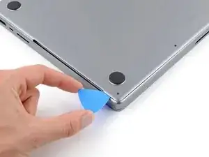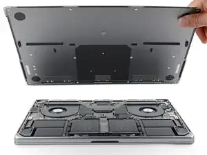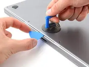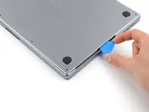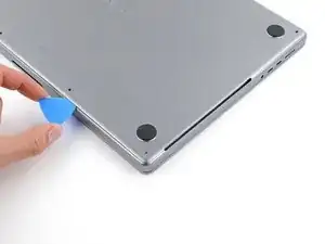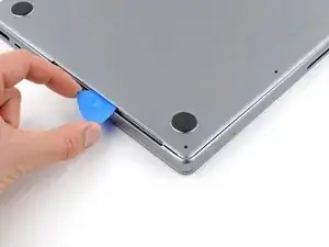 Держите нижнюю крышку плоско на MacBook. Не тяните вверх, пока она полностью не отделена.