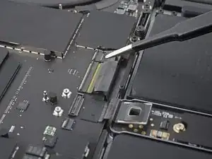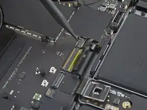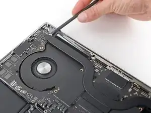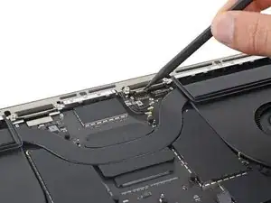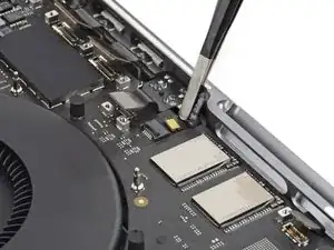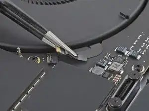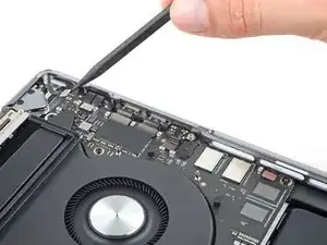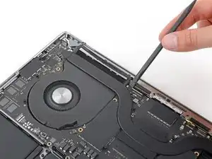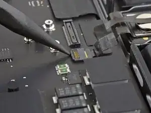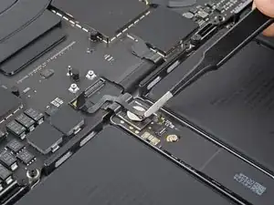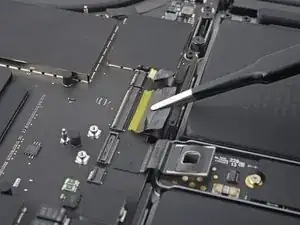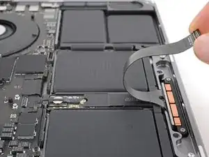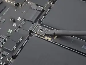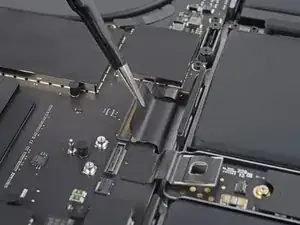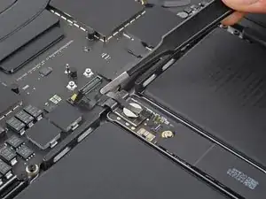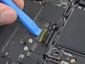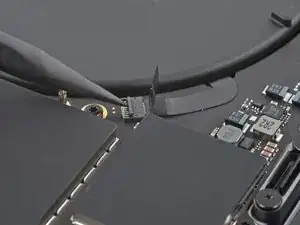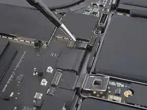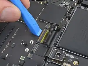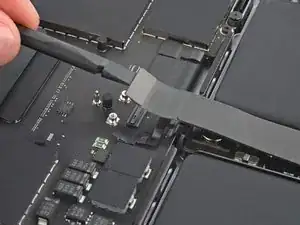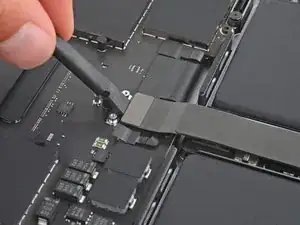 Плоским концом лопатки подденьте и отключите защёлку кабеля трекпада от логической платы.