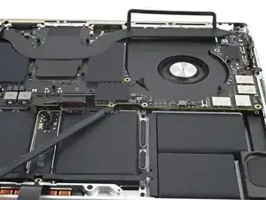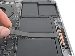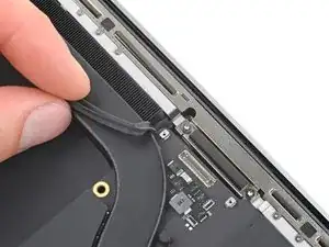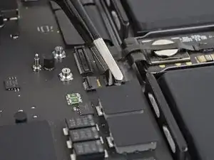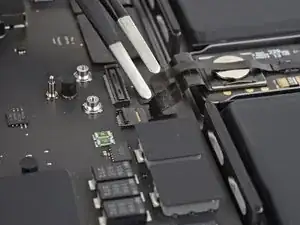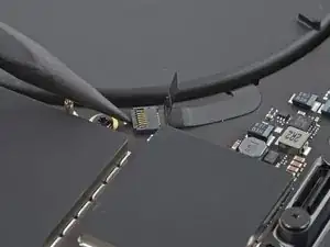 Отогните ленту, закрывающую разъем кабеля данных аккумулятора на логической плате.
