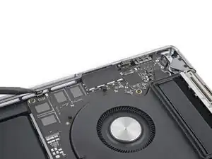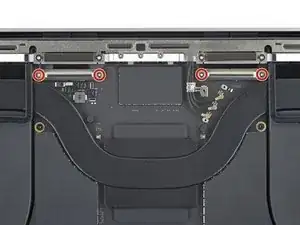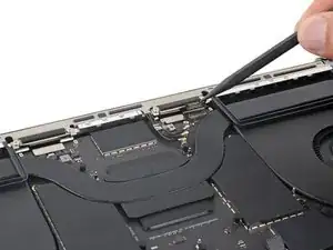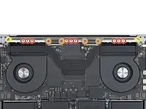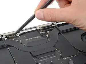 Защёлки, расположенные вдоль заднего края MacBook, дополнительно фиксируют нижнюю крышку. Отсоединение этих защёлок может потребовать значительного усилия — рассмотрите возможность использования перчаток для защиты рук от острых краёв нижней крышки.