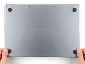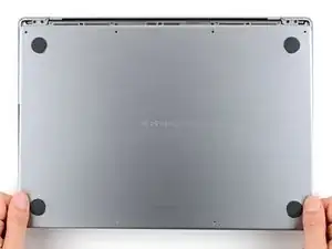 Положите её и совместите скользящие защёлки с задним краем MacBook. Надавите на нижнюю крышку и сдвиньте её к заднему краю, чтобы защёлки вошли в зацепление.