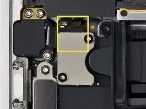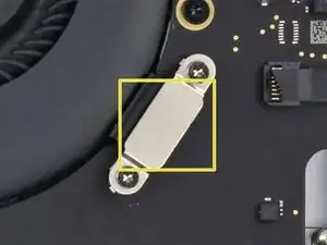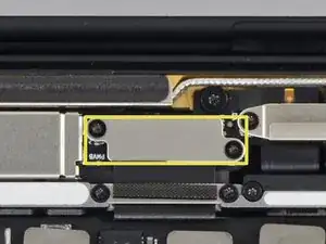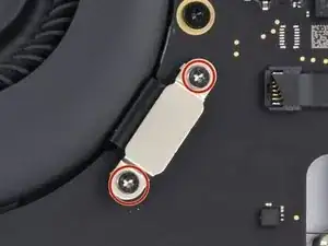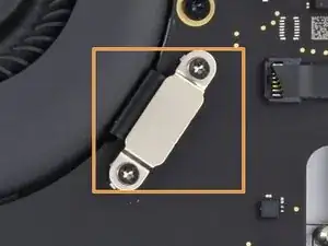 Используйте отвёртку под Torx T3, чтобы удалить два винта длиной 1,2 мм, крепящих скобу кабеля дисплея.