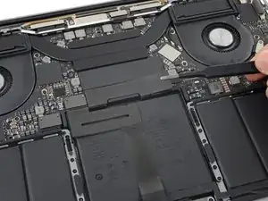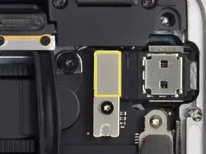 Осторожно отклейте и отогните большую полоску ленты, закрывающую разъём батареи, расположенную на краю платы логики ближе к батарее.