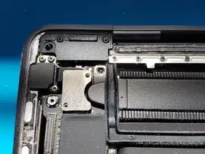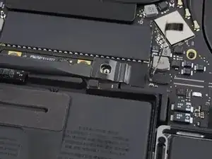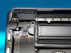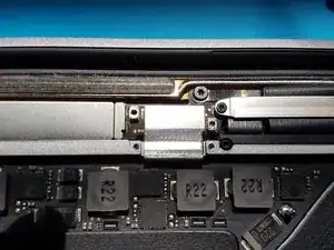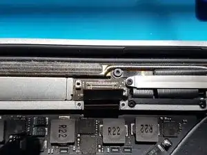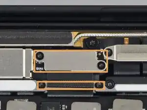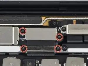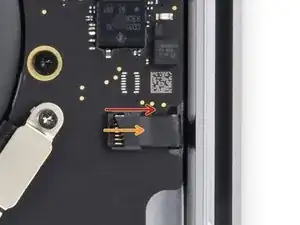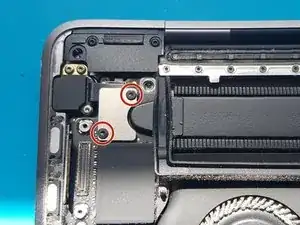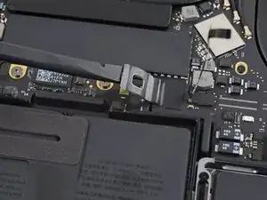 Используйте отвёртку T3 Torx, чтобы открутить два винта длиной 1,8 мм, фиксирующих кронштейн разъёма кабеля тачпада.