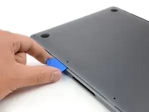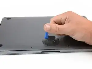 Прикрепите присоску к нижней крышке в передней центральной области MacBook Pro.