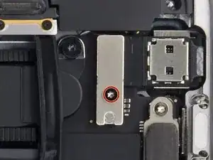 Используйте отвёртку под Torx T3, чтобы удалить два винта длиной 1,4 мм, крепящих скобу.