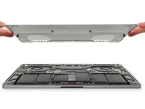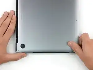 Твёрдо потяните нижнюю крышку вперед (в сторону переднего края MacBook, в противоположную от петель сторону), чтобы отсоединить последние защёлки, удерживающие её.