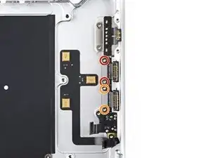 Используйте отвертку Torx 5IP, чтобы выкрутить два винта 3,6 мм, закрепляющих левый порт USB-C.
