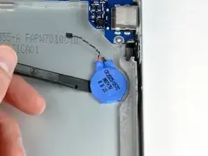 С помощью пластикового инструмента подденьте PRAM-батарею из нижнего корпуса.