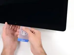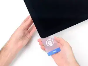 Вставьте вторую пластиковую карту в зазор между дисплеем и рамкой в верхнем левом углу iMac.