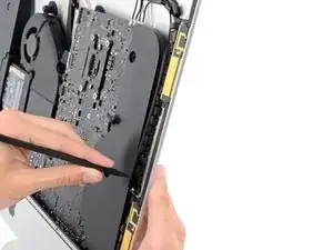 Используйте лопатку, чтобы ослабить разъём кабеля правого динамика от его гнезда на плате.