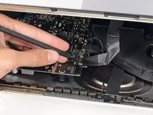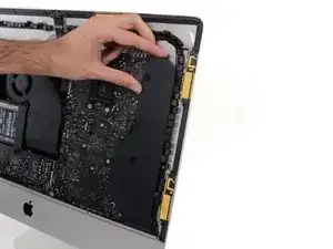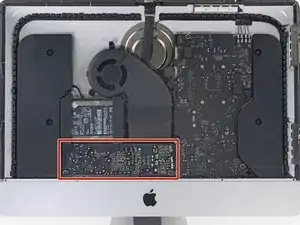 Возможно, потребуется отклеить прокладку из дисплейного клея, расположенную вдоль нижнего края корпуса iMac, чтобы получить доступ к винтам.