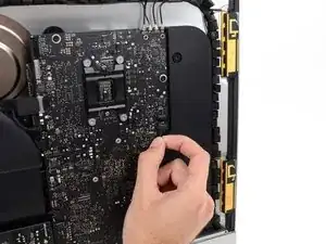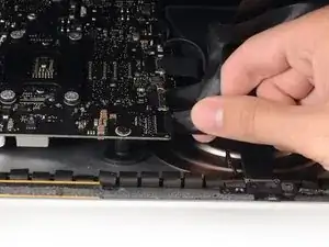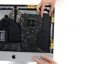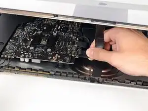 Переместите карту к центру дисплея, чтобы разрезать остатки клея в верхнем правом углу iMac.