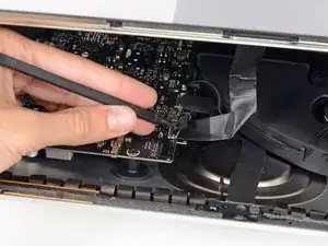 Начиная с левой стороны дисплея, рядом с кнопкой питания, вставьте инструмент для открытия iMac в зазор между стеклянной панелью и задним корпусом.