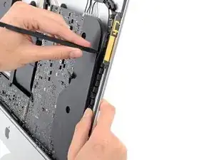 На этом этапе вдоль нижнего края дисплея остаётся полоска клея, которая удерживает дисплей на раме, как шарнир. Этот клей можно ослабить, несколько раз осторожно покачивая дисплей вверх и вниз.