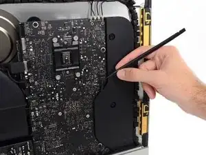 Поскольку петля может свободно двигаться, iMac будет несбалансирован и сложен в работе. Ремонт можно завершить, как показано, но с использованием установочной прокладки для iMac процесс будет быстрее и проще.