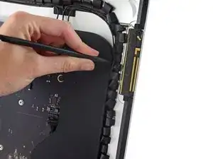 Вам может потребоваться отогнуть клеевую подкладку дисплея вдоль нижнего края корпуса iMac, чтобы получить доступ к винтам.