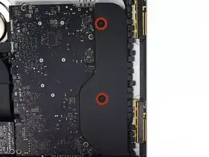Удалите два винта T10 длиной 10,0 мм, фиксирующие правый динамик к задней панели корпуса.