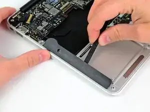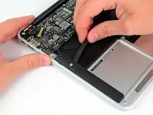 Используйте плоский конец лопатки, чтобы поддеть обе короткие стороны разъёма аккумулятора вверх и отсоединить его от гнезда на плате.