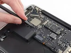 Возьмите прозрачный пластиковый язычок, прикрепленный к разъему батареи, и потяните его к переднему краю Air, чтобы отключить батарею от материнской платы.