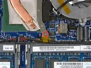 Серебристо-оплётённый Bluetooth-кабель может закрывать винт. Если это так, аккуратно отодвиньте его в сторону. Возможно, потребуется снять винт, удерживающий заземляющий экран для двух соседних кабелей, прежде чем вы сможете достаточно отодвинуть Bluetooth-кабель. В более ранних моделях этот винт имеет длину 7 мм, а в моделях Santa Rosa/Penryn и 2009 года может быть 4,2 мм.