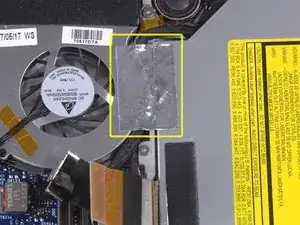 Отклейте фольгированную ленту между вентилятором и оптическим приводом. Поднимите ленту со стороны вентилятора, оставив её приклеенной к оптическому приводу.