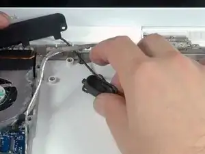 Используйте лопаточку, чтобы отключить разъём правого динамика от логической платы.