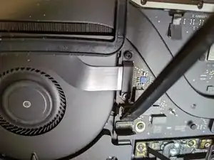 Используйте наконечник лопатки, чтобы поднять маленькую чёрную фиксирующую планку, удерживающую шлейф в разъёме.