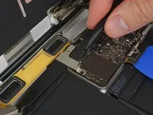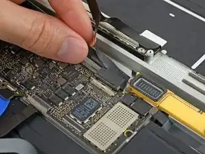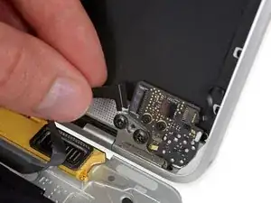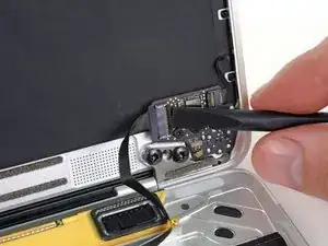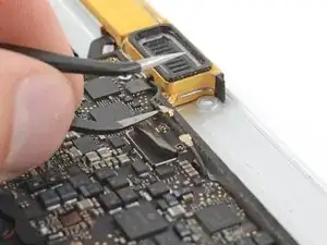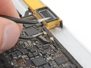 Используйте пинцет, чтобы отогнуть ленту, закрывающую разъём дисплейного кабеля.