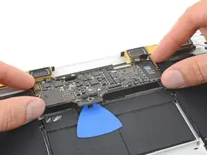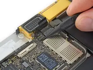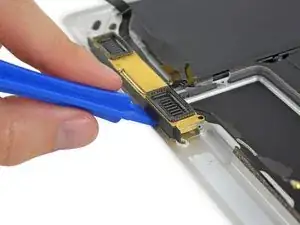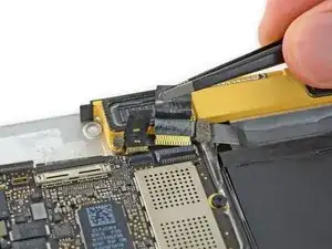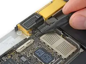 Используйте лопатку, чтобы отсоединить коннектор кабеля левого динамика, поддев его прямо вверх от платы логики.