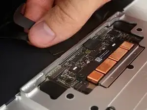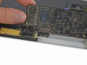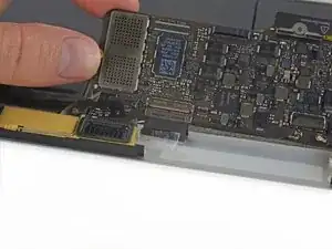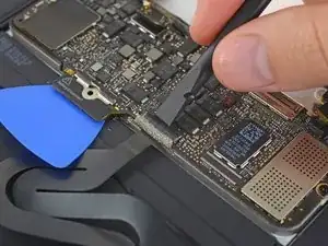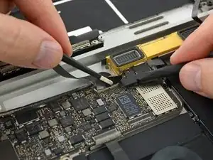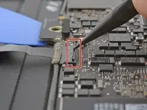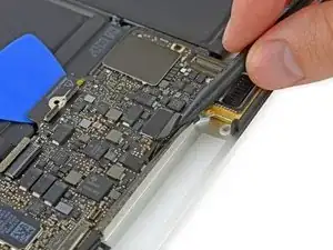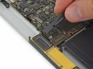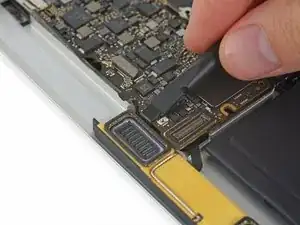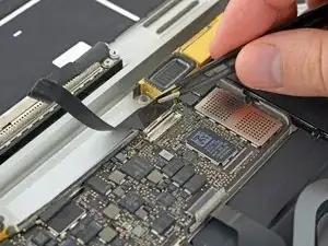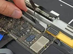 Используйте пинцет, чтобы отогнуть ленту, закрывающую ZIF-разъём шлейфа трекпада.