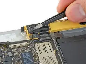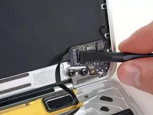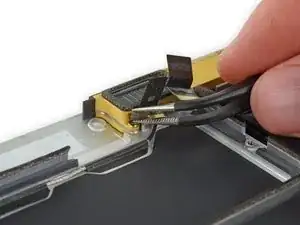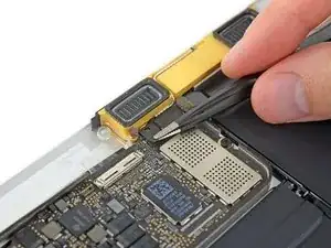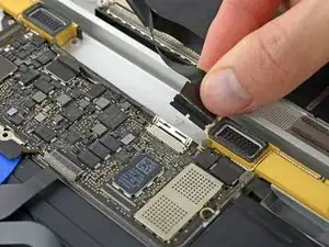 С помощью пинцета отогните ленту, закрывающую два ZIF-разъёма — один для кабеля правого динамика и один для кабеля платы аудиоразъёма.