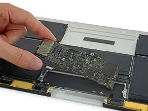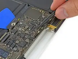 Для сборки устройства выполните эти инструкции в обратном порядке. Чтобы избежать повреждения платы логики, когда ремонт MacBook завершён но до включения питания, подключите его к низковольтному источнику питания с помощью 5-Вт зарядного устройства для iPhone и кабеля USB-C — USB-A.