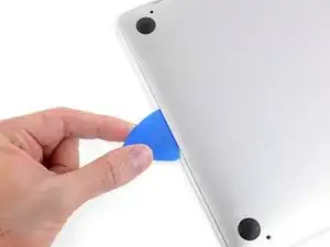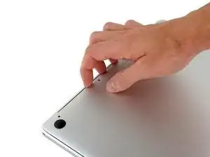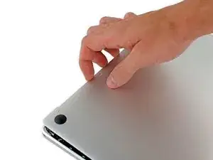 Просуньте пальцы между верхней и нижней частями корпуса, начиная с задней части MacBook между петлями.