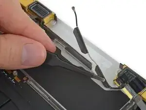 Пинцетом аккуратно оторвите ленту, фиксирующую кабель правой антенны к нижней части корпуса.
