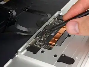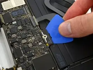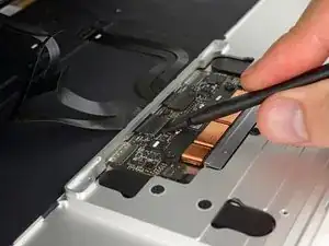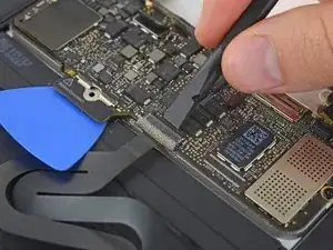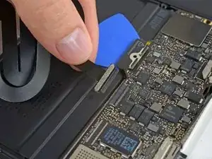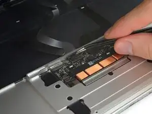 Используйте лопатку, чтобы откинуть удерживающую защёлку на ZIF-разъёме кабеля тачпада.