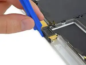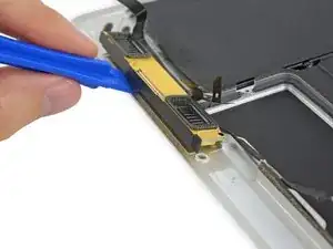 Используйте плоский конец лопатки, чтобы откинуть удерживающую защёлку на разъёме дисплейного кабеля.