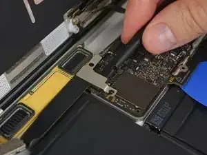 Поднимите и отсоедините экранную ленту, фиксирующую плату логики к нижней части корпуса.