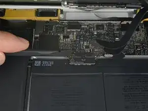 Будьте внимательны, чтобы не повредить кабель. Если кабель не отделяется легко, нагрейте кабель и/или корпус под ним феном или iOpener, чтобы размягчить клей, и попробуйте снова.