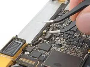 Вставьте одну ветвь изогнутого пинцета под металлическую шейку первого антенного разъёма и подденьте вверх, чтобы отсоединить его.